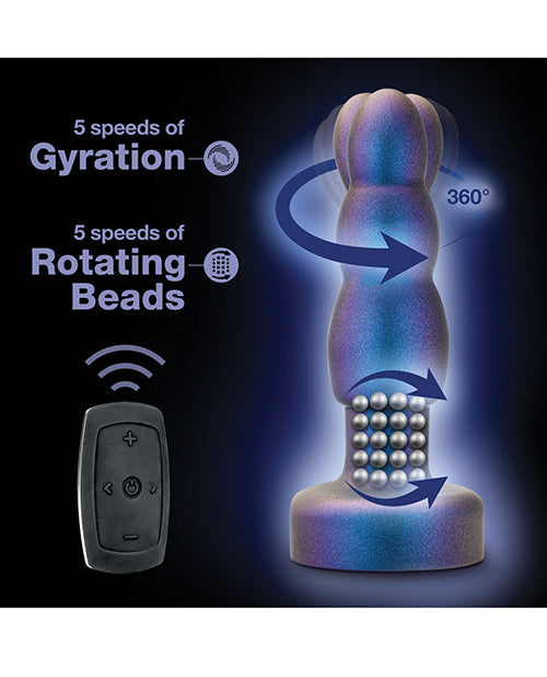 This beautiful, thoughtfully designed remote-controlled anal plug enveloped in a shimmering iridescent finish is designed with its 5 rows of rotating anal beads to stimulate the sensitive nerve endings in the anus, providing intense sensations that can lead to powerful orgasms. The tapered tip makes insertion easy, while the wide base ensures that the plug stays securely in place. Enjoy anal play in the bath as even the remote control is fully IPX7 submersible waterproof. Play alone or with your partner. The platinum cured Puria™ Silicone, with its silky smooth Ultrasilk® warms with your body heat beautifully. The Magna Charge™ rechargeable battery ensures that it is always ready for use, and the powerful vibrations adds an extra level of pleasure. Using the 4 way wireless remote you can conveniently choose from the 5 shaft gyrating speeds and 5 speed rotating beads for rimming sensations as well as the 10 vibration modes. The shape was designed for maximum pleasure which is magnified when you slowly thrust the plug. The bubble shapes POPPING in and out will make you ooh and ahh. You pick your pleasure with the posable shaft which can be bent to gyrate minimally or widely for maximum pleasure. The plug has a 5.75 inch length (4 inch insertable) and a 1.5 inch width. This plug contains no fragrances, phthalates, paraffins, or latex. Lab tested body safe and meets or exceeds all REACH and Prop65 product safety standards. 45 minutes run time from a full charge. Water, Hybrid Lube Safe. Hypoallergenic.