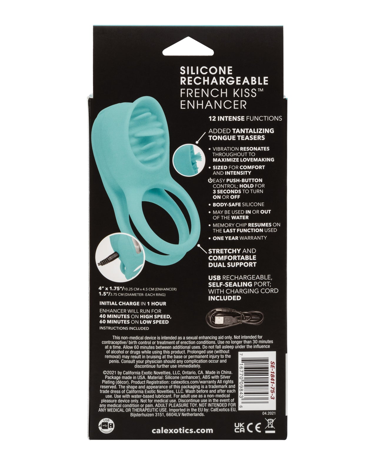 The Silicone Rechargeable French Kiss™ Enhancer uses the perfect mix of 12 functions of vibration with a flickering teaser ring to deliver double the knee-shaking pleasure. The stretchy dual supportive ring is made to intensify pleasure for both beginners and erotic experts alike.