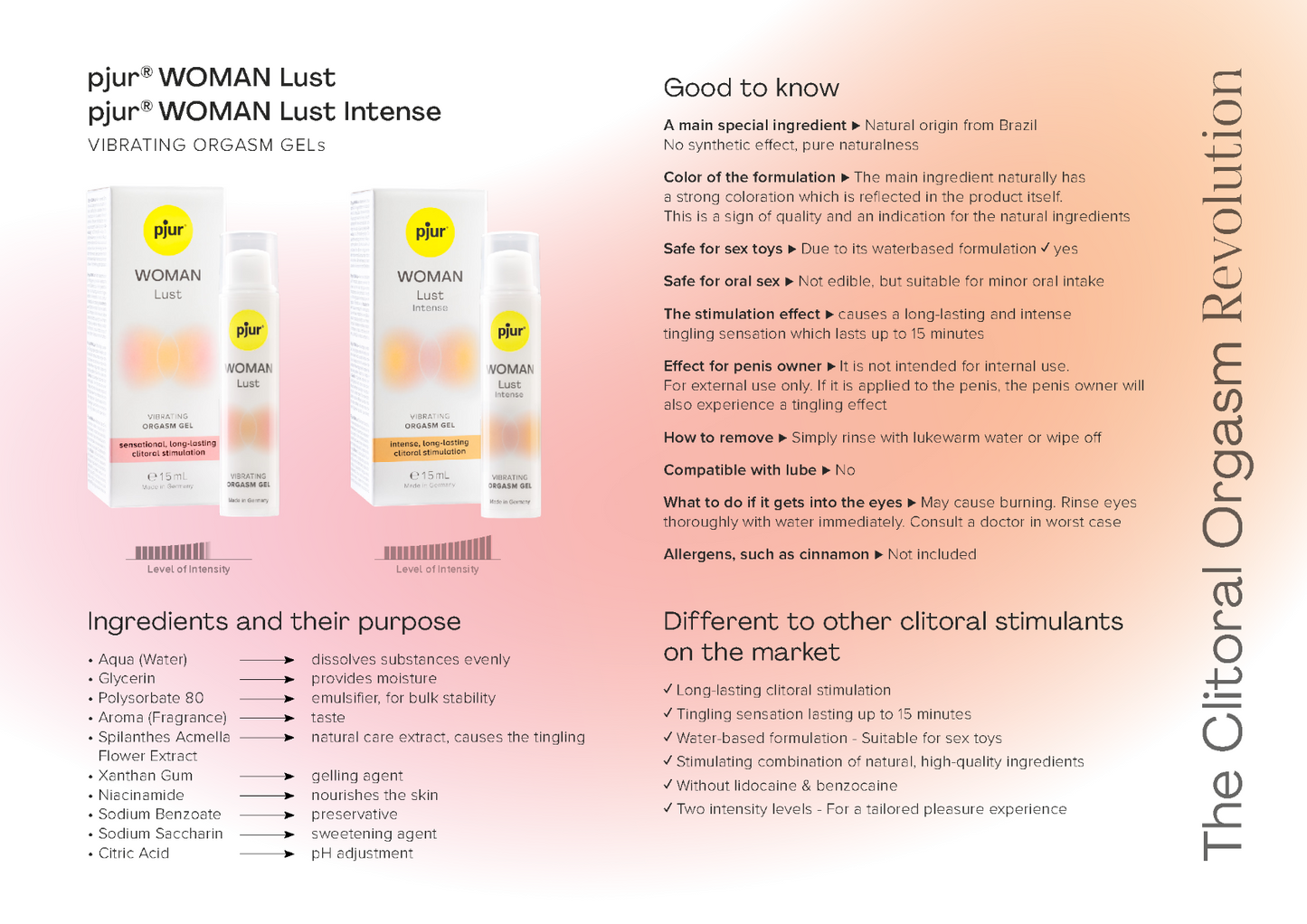 Pjur Woman Lust. Sensational, long-lasting clitoral stimulation. Water-based stimulation gel. The long-lasting, passionate experience for women. Experience pure tingling sensations thanks to the stimulating combination of ingredients. With a high proportion of natural, premium ingredients. Suitable...