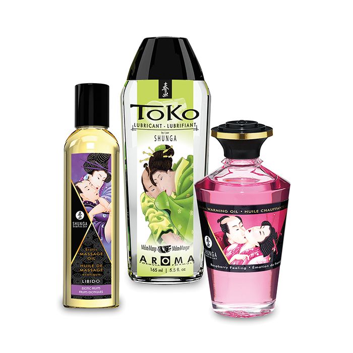 This collection of exquisite fruity sensual products will bring you to a passion-enhancing adventure. Bring excitement to new heights and experience wild fruity foreplay. Includes : Libido Exotic fruits Erotic Massage oil, Toko Aroma Melon-Mango Flavored Lubricant, Raspberry Warming Aphrodisiac oil.