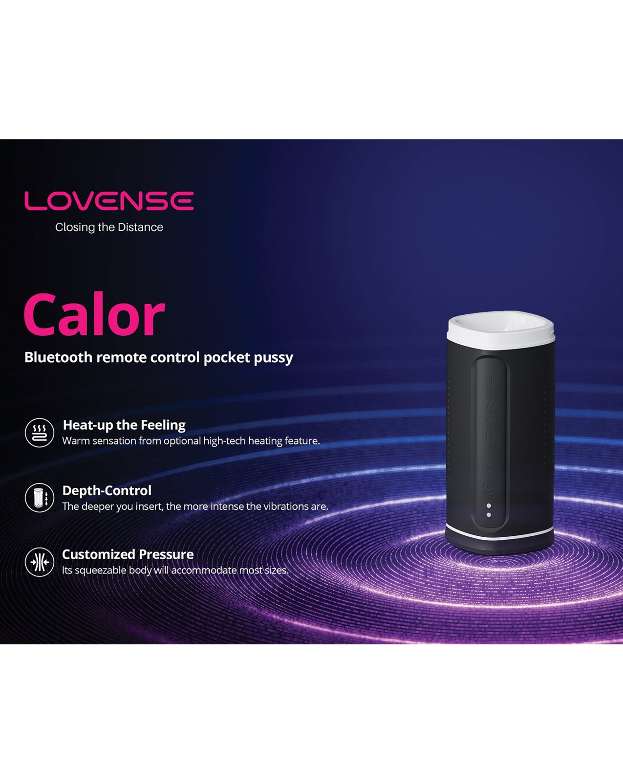 App-enabled.AVAILABLE TO U.S. CUSTOMERS ONLY Calor is a portable depth-controlled male masturbator which can be customized to a wide range of vibration levels. Choose a power level to match your body's needs and save it for a later use. Also, program up to 10 favorite patterns! High tech warming function. Choose whatever you prefer: vibration, squeezing, heating or depth-control. Control it yourself, ask you lover to do it from miles away or sync it with another toy. The inside of the toy is covered with super-soft silicone. Calor is a versatile toy that offers so many different ways of using it. Simplistic design makes Calor easy to clean after a hot night. You won't want to leave it home when traveling because its also lightweight! Unlimited vibration patterns. Sound-activated vibrations. Sync to music Compatible With: iPhone/iPad/iPod Touch iOS 11.0 and later. Android 5.0 and later (with Bluetooth 4.0 enabled) Mac (with Bluetooth 4.0 enabled) Windows PC (needs a Lovense USB Bluetooth Adapter to connect) IPX7 Waterproof. USB rechargeable - 1.5-2 hours continuous use. One Year Warranty. Prohibited selling platforms includes but are not limited to: Amazon, eBay, including all 3rd party marketplace sites, even if they are operated and controlled exclusively by the authorized re-seller.Rebates, coupons, credits, percentage discounts or any manner of discounting which results in a net price in cart below Lovense MAP pricing regardless of circumstances will be considered as not complying with the MAP policy.