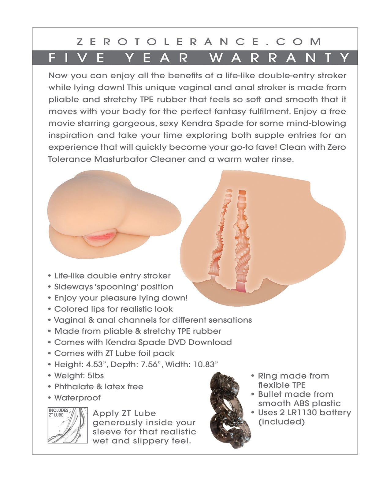 Now you can enjoy all the benefits of a life-like double-entry stroker while lying down! This unique vaginal and anal stroker is made from pliable and stretchy TPE rubber that feels so soft and smooth that it moves with your body for the perfect fantasy fulfilment. Enjoy a free movie starring gorgeous, sexy Kendra Spade for some mind-blowing inspiration and take your time exploring both supple entries for an experience that will quickly become your go-to fave! Clean with ZT Masturbator Cleaner and a warm water rinse.