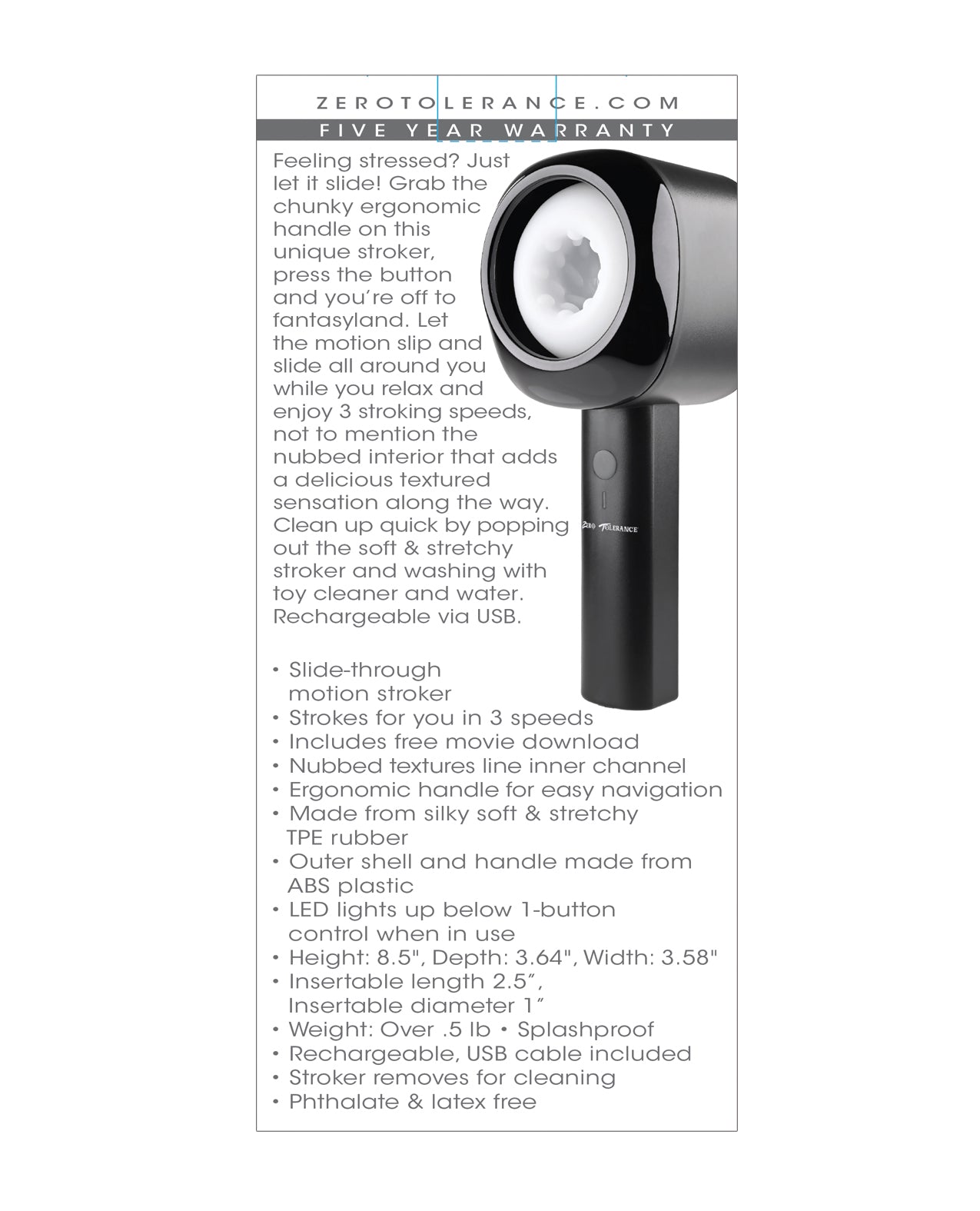Feeling stressed? Just let it slide! Grab the chunky ergonomic handle on this unique stroker, press the button and you’re off to fantasyland. Let the motion slip and slide all around you while you relax and enjoy 3 stroking speeds, not to mention the nubbed interior that adds a delicious textured sensation along the way. Clean up quick by popping out the soft & stretchy stroker and washing with toy cleaner and water. Rechargeable via USB. Five Year Warranty.